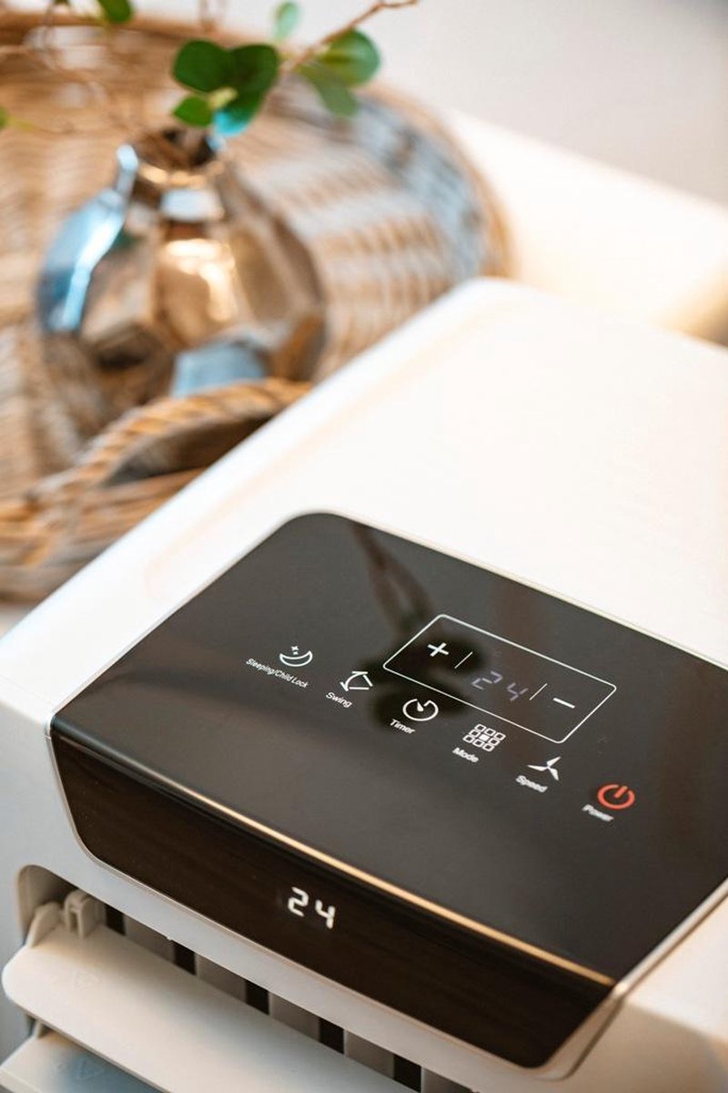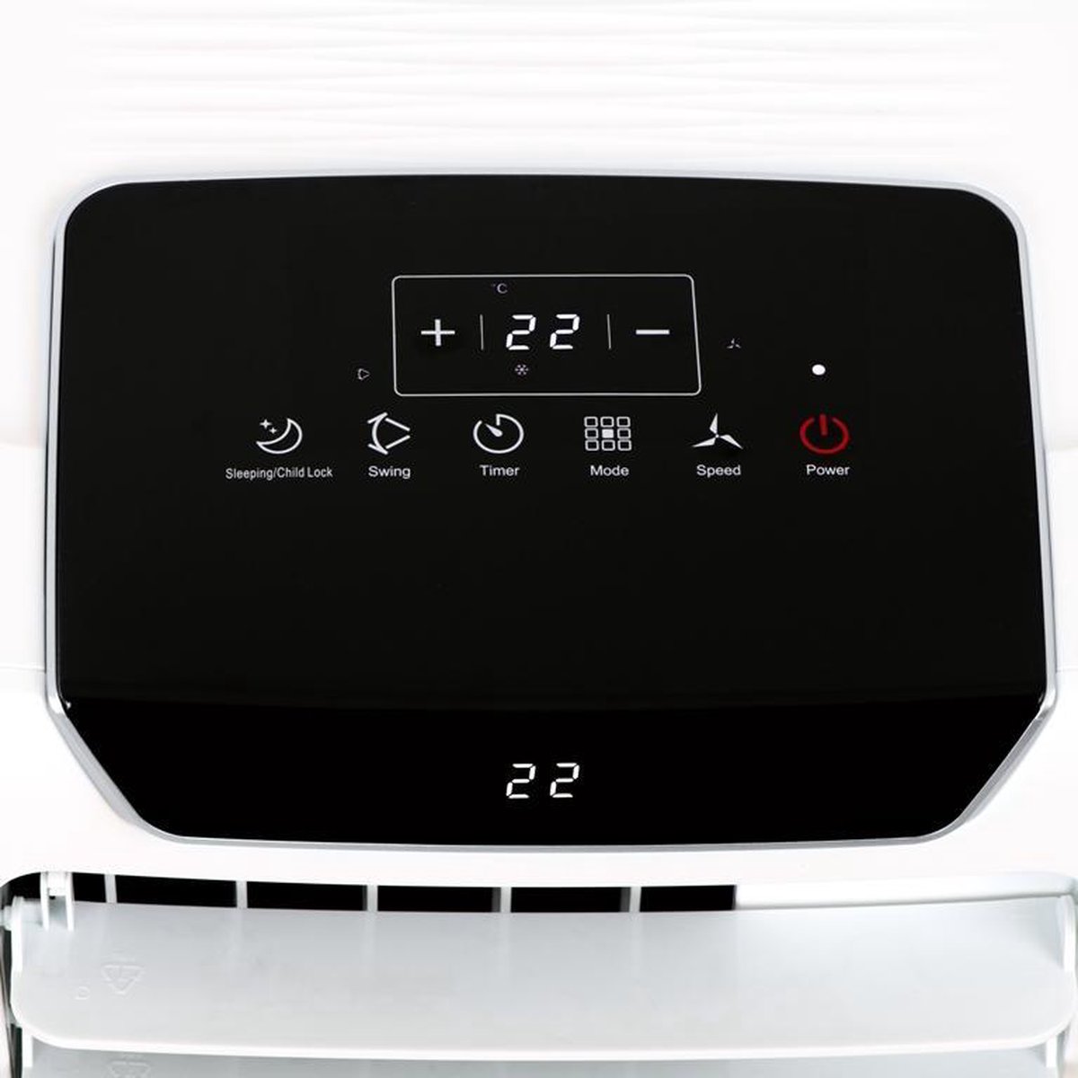 Met buitenafmetingen van slechts 36,7 x 35,3 x 68,4 cm past deze mobiele airconditioning perfect in elke ruimte. Verkrijgbaar in zwart of wit, en met eenvoudige bediening via het gebruiksvriendelijke LED-scherm.