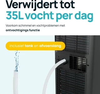 Installatie is snel en eenvoudig: bevestig de meegeleverde raamafdichtingskit, sluit de 150 cm afvoerslang aan en steek de stekker in het stopcontact. Geen gereedschap of monteur nodig — verplaats de unit eenvoudig naar de kamer waar je hem nodig hebt.